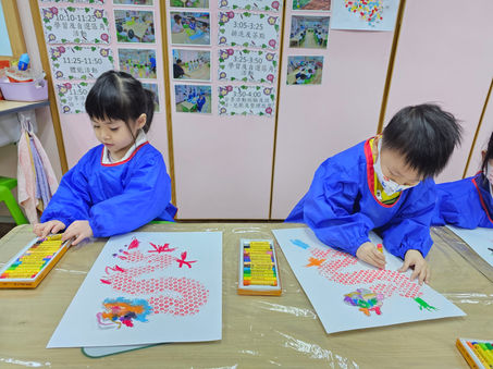 The teacher will use a presentation to introduce the cultural background of the dragon and its symbolic meaning in traditional festivals, and display pictures of dragons in various forms. Children will apply watercolors to bubble wrap and press it onto white paper to create the dragon's body, and use pastels to draw the dragon's head, claws, and tail. Then, they will attach the character "龍" (dragon) in different calligraphic styles; finally, the children will appreciate the collaborative artwork and share their creative process.